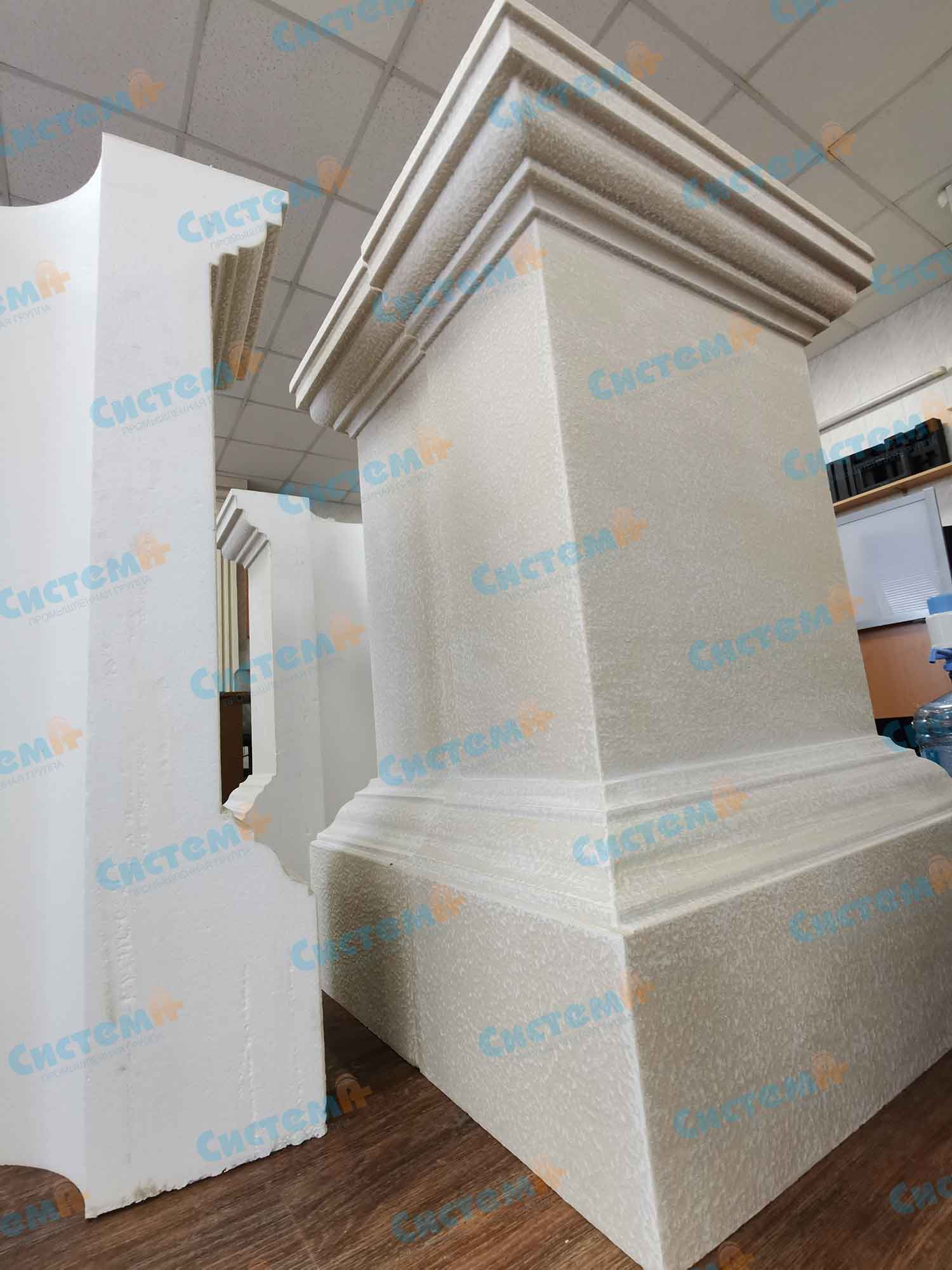 Этап выбора материала и защитного покрытия прошел быстро, так как ранее мы уже сотрудничали с клиентом, и он остался доволен качеством используемого сырья. Для изготовления капителей и оснований колонн выбрали пенополистирол как материал-основу и защитно-декоративное кварцевое покрытие.
